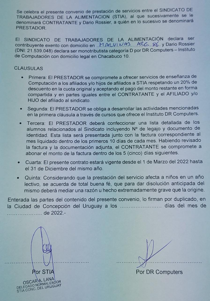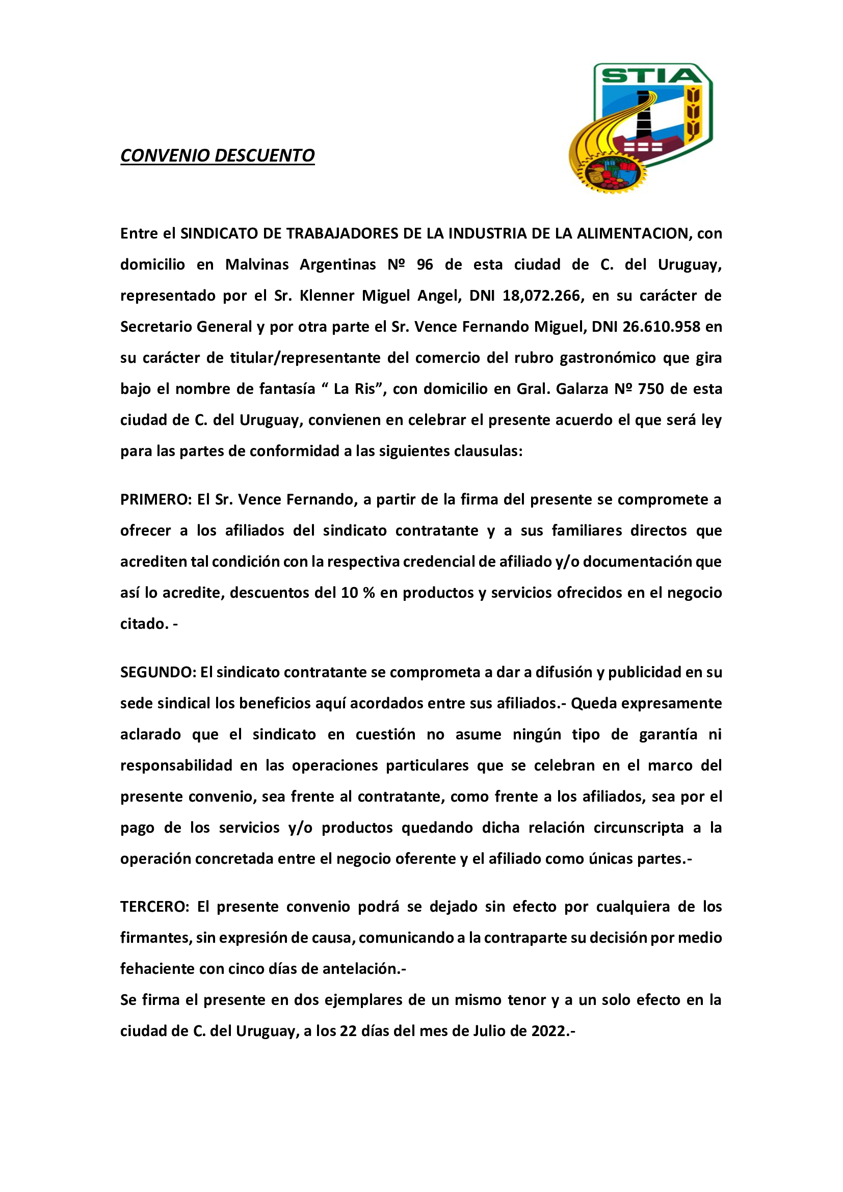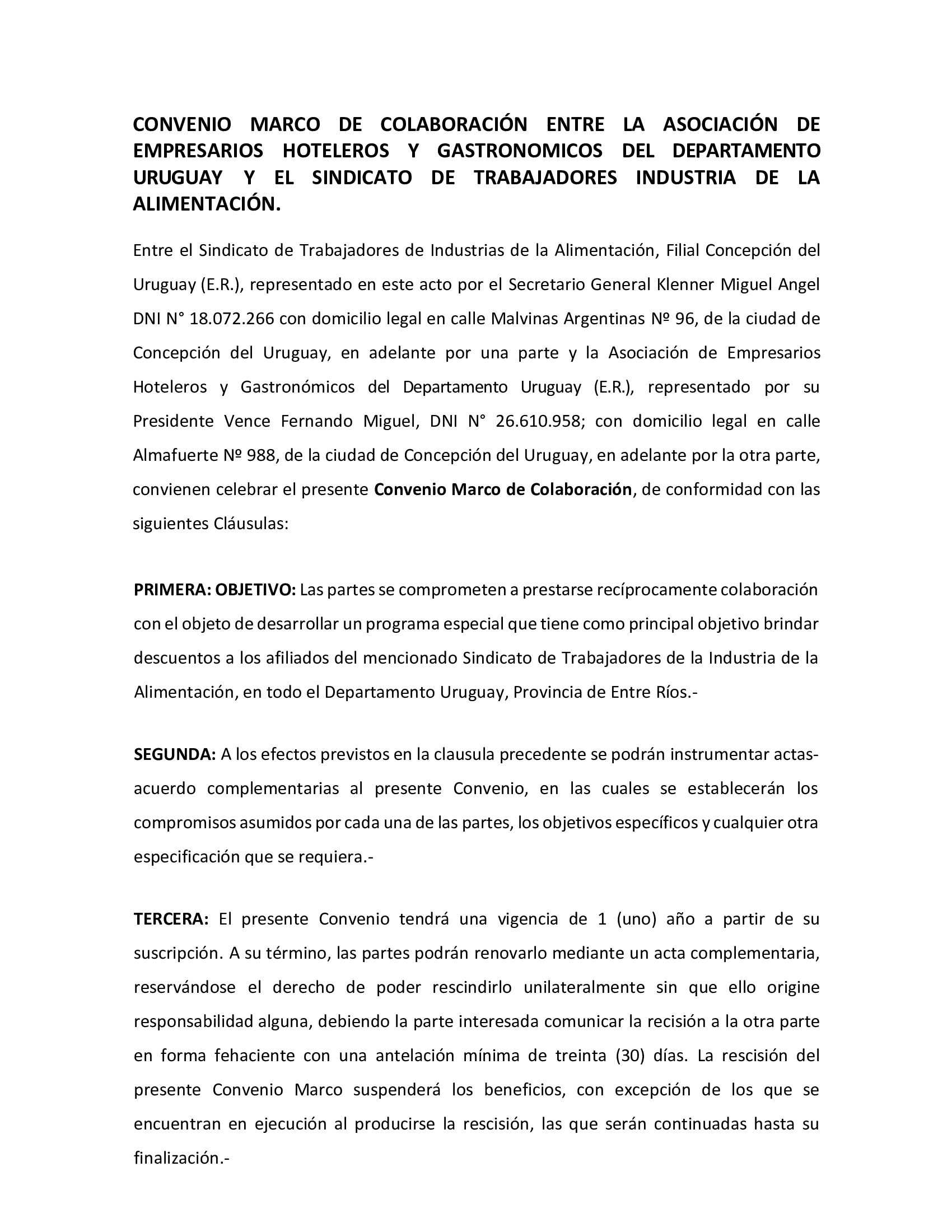 Convenios Resolución 860/22 Acuerdo con la Federación de Industrias de Productos Alimenticios y Afines Convenio Anglo-Ingles Convenio DR Computers Acuerdo Secretaría de Turismo de Entre Ríos Acuerdo Hoteleros y Gastronómicos Acuerdo Hoteleros y Gastronómicos, Parte 2 Acuerdo Confiteria Ris